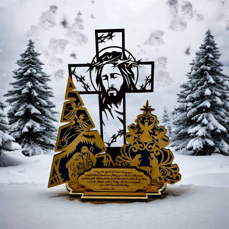 This display brings together the heart of Christmas through three beautifully crafted wooden pieces set in a peaceful winter scene. At the center is a cross featuring an image of Jesus wearing a crown of thorns, a reminder of both sacrifice and love. Beside it stand two ornate Christmas‑tree silhouettes, each carved with scenes from the nativity—Mary, Joseph, and the newborn Jesus surrounded by angels, wise men, and gentle animals. Snow-covered pines and a soft winter sky frame the arrangement, giving the whole scene a quiet, reverent atmosphere. The engraved message speaks of comfort, peace, and Christ’s healing presence, offering encouragement to anyone walking through a difficult season.